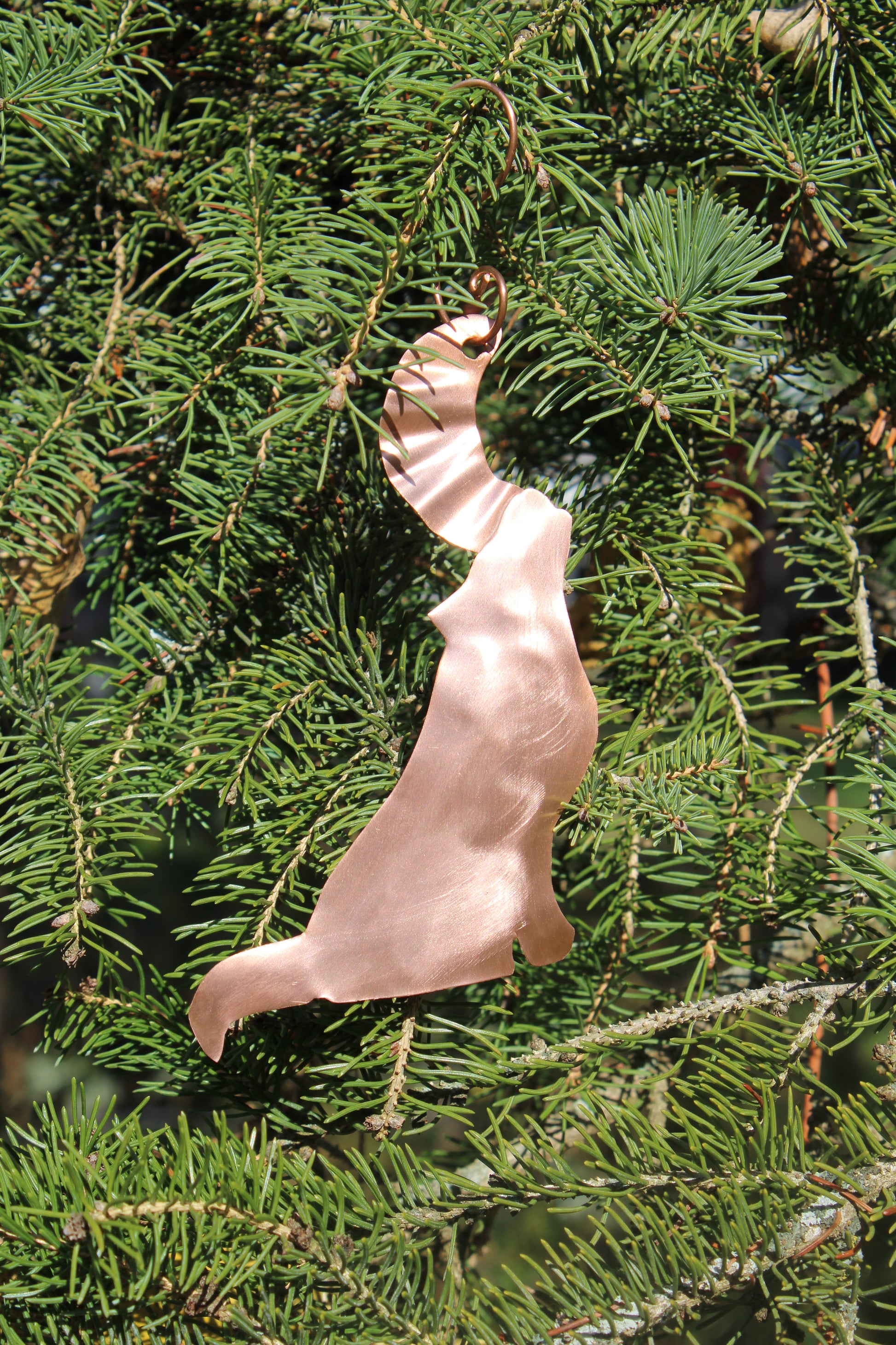 This elegant copper ornament features a wolf howling at a crescent moon, both artfully shaped to add dimension and depth. Measuring 5 inches tall and 3 inches wide, it hangs from a 2-inch copper hook. Smooth and polished, this piece beautifully captures the quiet strength of the wilderness — a perfect accent for nature lovers and moon watchers alike.